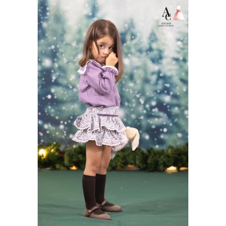 Falda pantalón en pana color morado con dos volantes acabado en puntilla y con goma en la cintura para ajustar