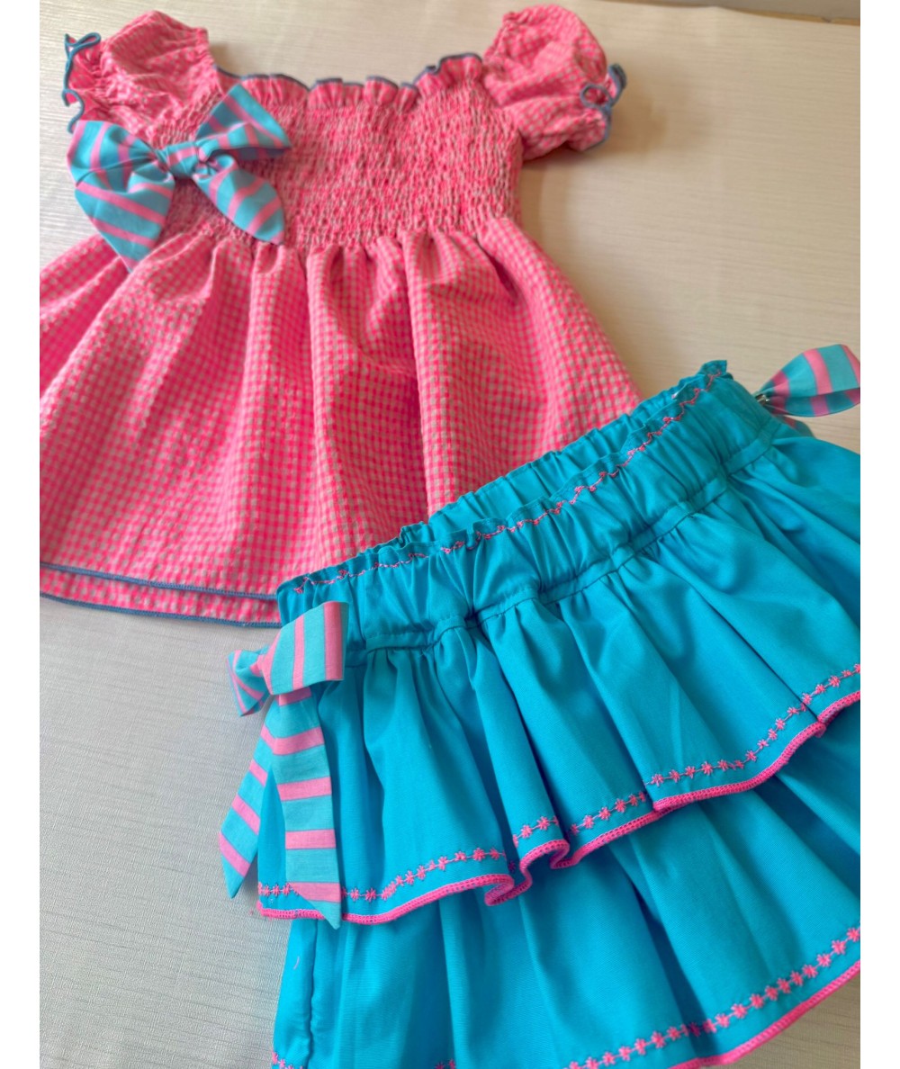 Braga falda turquesa con dos volantes que acaban con remate y bordado en fucsia fluorescente