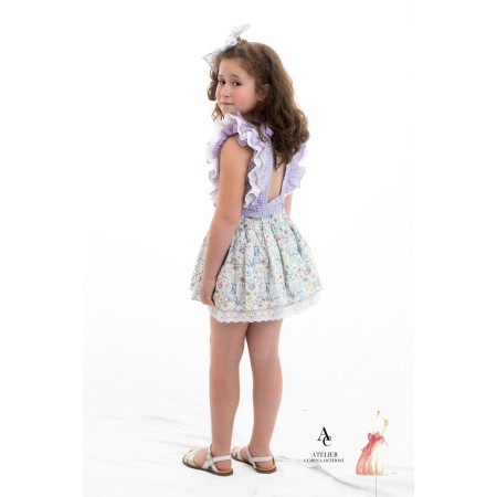 Falda niña estampada con flores liberty en tonos lavanda y goma en la cintura para ajustar