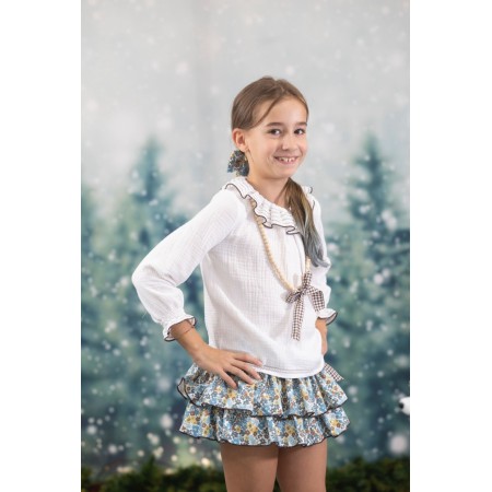 Camisa blanca de bámbula rematada con marrón de manga larga