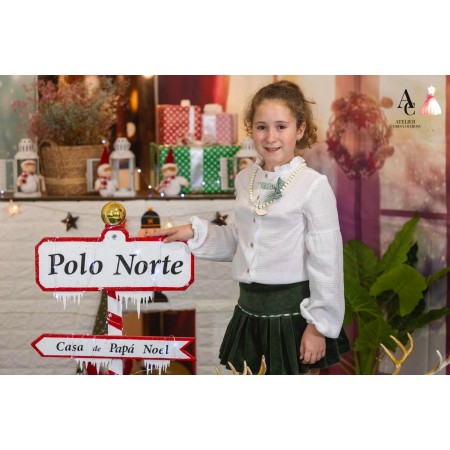 Conjunto verde chaleco vichy compuesto por camisa bambula blanca con goma en puños, falda tablas verde botella con pantalón interior con cremallera al lado y goma con botón en la cintura
