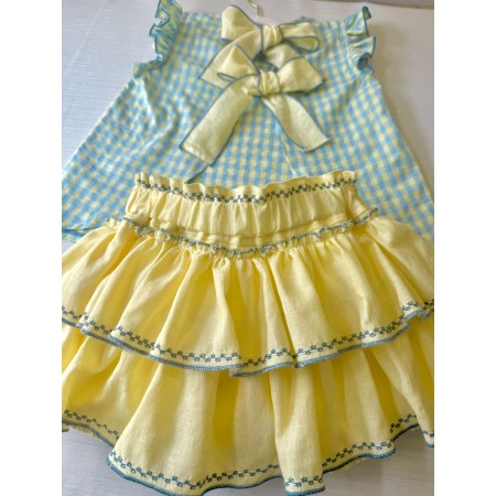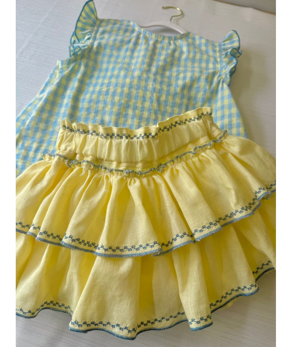Conjunto compuesto por bombacho falda con dos volantes que acaban con remate y bordado azul y camisa en vichy amarilla y azul con lazada en la espalda