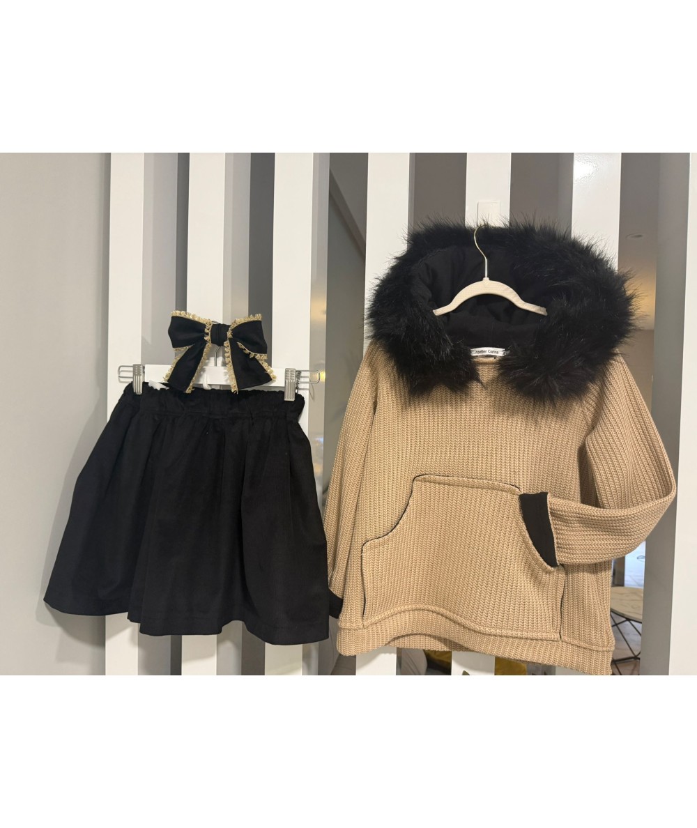 Jersey en camel con pelo negro en la capucha y falda de micropana negra con goma en la cintura para ajustar
