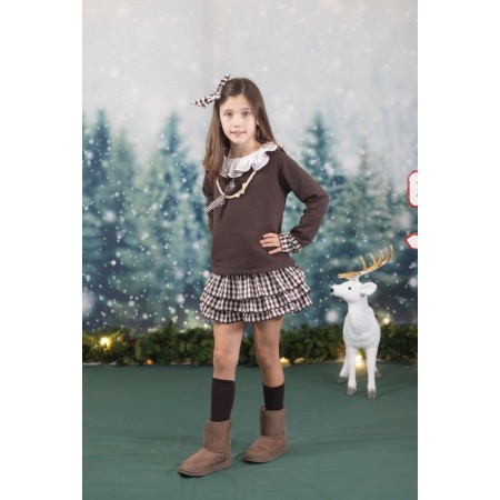 Sudadera marrón de tela  French Terry con pelo interior, cuella bámbula en blanco con remate marrón y puños en vichy