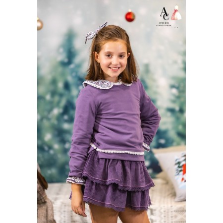 Sudadera niña morada con pelito por dentro y puntilla en el cuello
