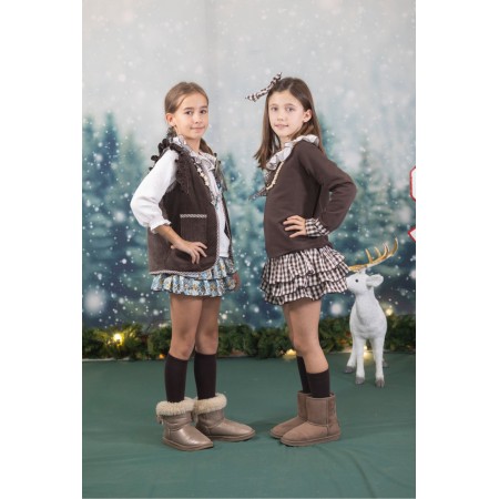 Sudadera marrón de tela French Terry con pelo interior, cuella bámbula en blanco con remate marrón y puños en vichy