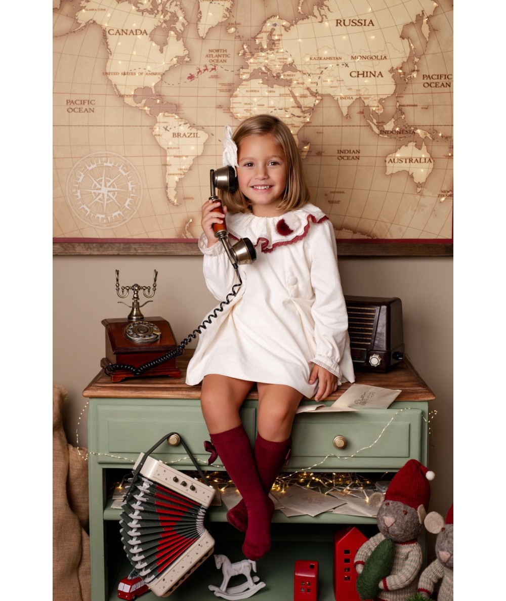 Vestido niña en micropana combinado con burdeos, abrocha con botones atrás, en la parte delantera tiene dos botones de adorno a cada lado. El cuello lleva dos pompones crudo y burdeos.
